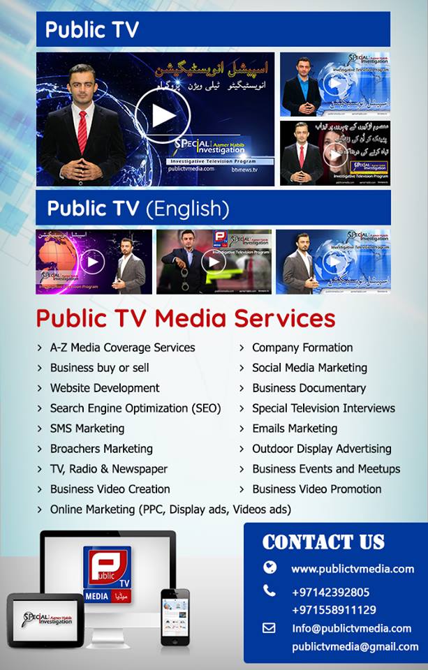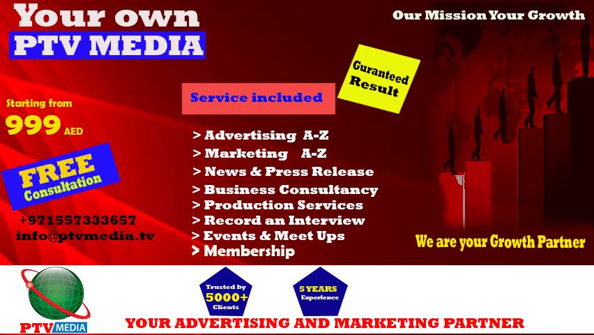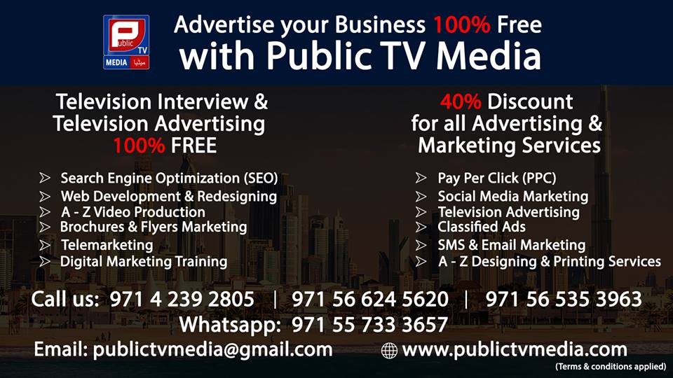 Public TV Media is A to Z business platform. We stay with businessmen till his huge success. We provide best business idea and plan. We register business in all over the UAE. We also buy and sell business. We are also providing All Advertising and Marketing services under one roof. we develop website and then every type of advertising and marketing services which can grow business in days rather than in years or months. We are also providing Video production services and Designing and Printing services. And if any businessman or manager wants to get business training we are also giving special business training which can increase business and management skills. Contact Us for your success.
